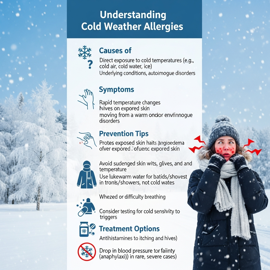 Cold urticaria or cold weather allergies are negative reactions of the skin to cold. Contrary to the usual allergies caused by pollen or dust, allergies are developed based on the reaction to cold air, water, or objects. This condition can vary from mild irritation to severe allergic reactions, including hives, swelling, and in rare cases, anaphylaxis.